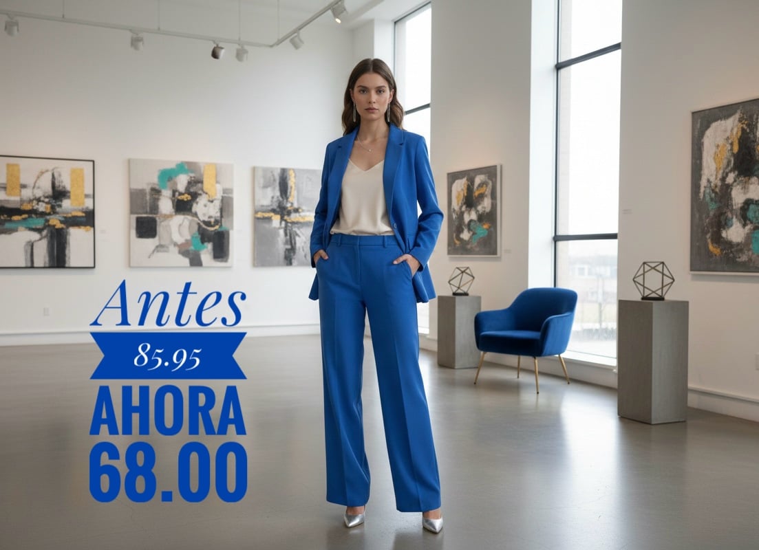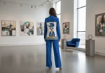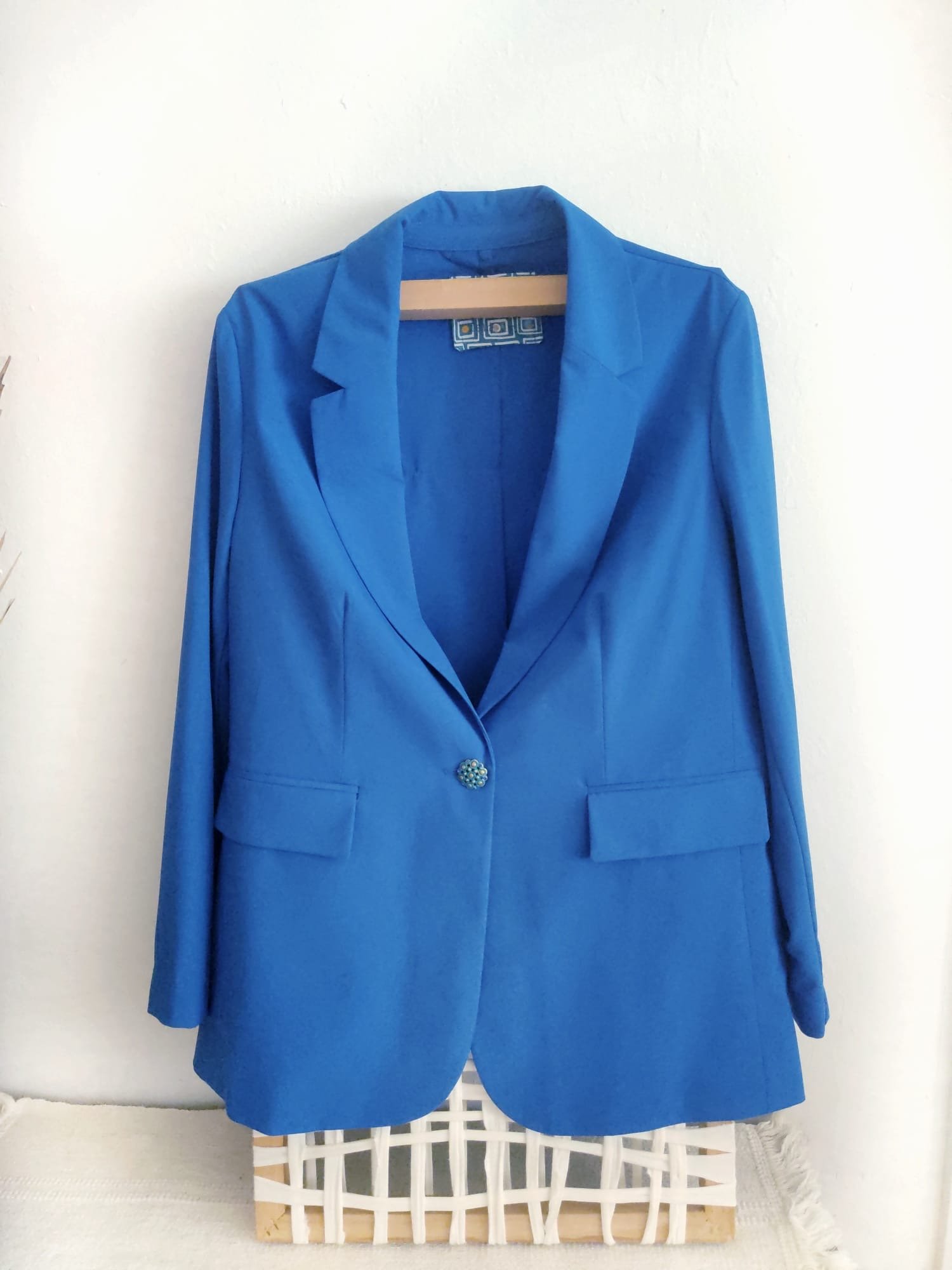 Blazer de cuello de solapa clásico y manga larga. Confeccionada en un tejido de peso medio y caída fluida (Tencel o similar) en un hermoso color Azul Klein vibrante. Esta pieza de edición limitada destaca por su aplicación artística cosida y pintada a mano en la espalda, que presenta una figura en pose de meditación enmarcada con encaje dorado. Incorpora bolsillos de tapeta laterales y un cierre frontal con un solo botón joya de inspiración vintage.