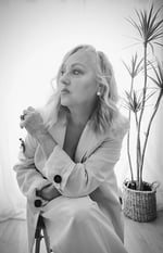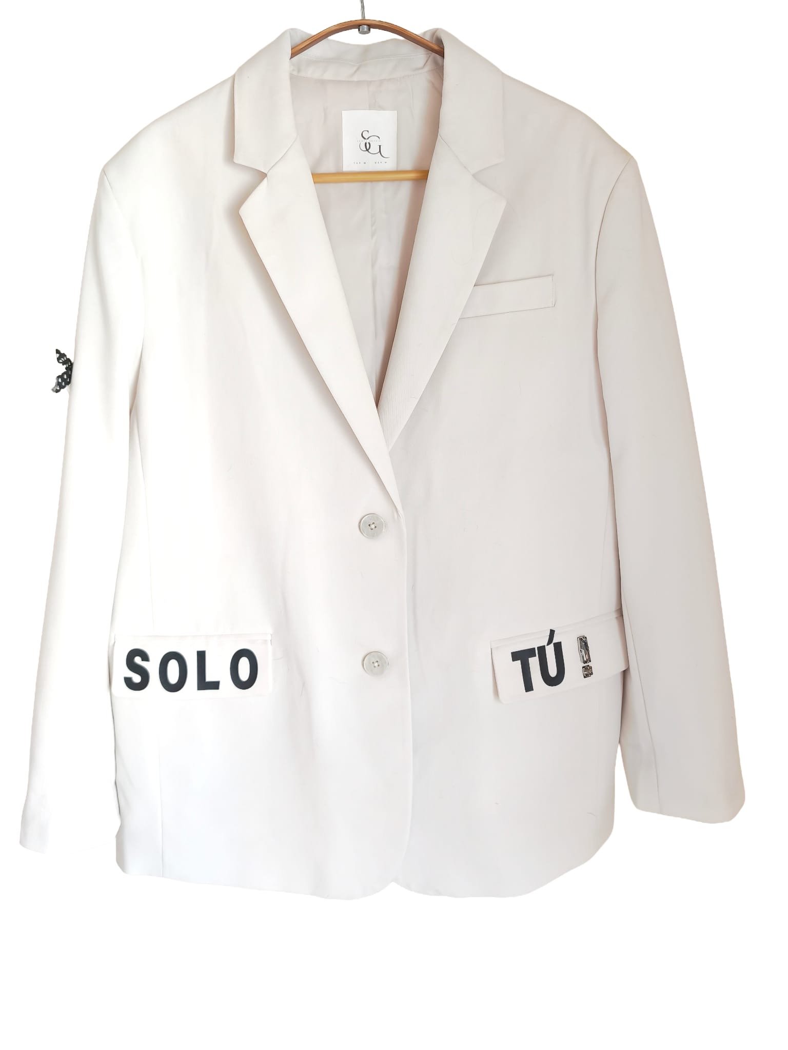 Blazer color hueso con un llamativo estampado trasero de una figura de moda. Con los textos "ESSENCE" y un símbolo de hashtag, esta pieza única fusiona el arte callejero con la sofisticación, perfecta para quienes buscan un estilo audaz y moderno.