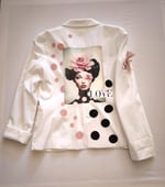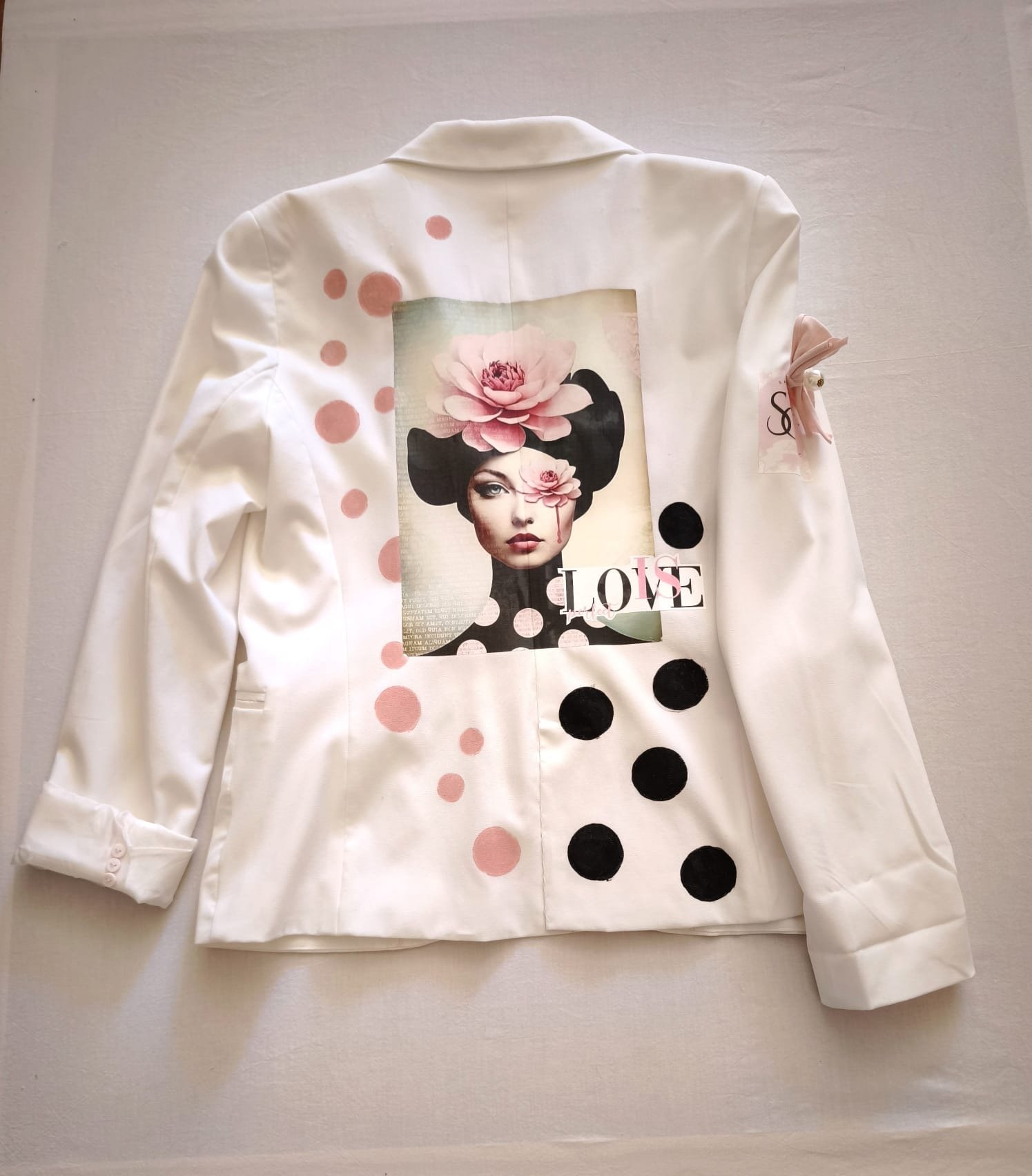 Blazer de cuello de solapa clásico y manga larga. Confeccionada en un tejido de peso medio y caída fluida (Tencel o similar) en un hermoso color blanco puro. Esta pieza es de diseño único y artesanal, con una aplicación ilustrada en la espalda que combina pintura y diseño textil, junto con detalles cosidos a mano como el lazo de adorno en la manga. Presenta bolsillos de ojal laterales y cierre frontal con un solo botón forrado al tono.