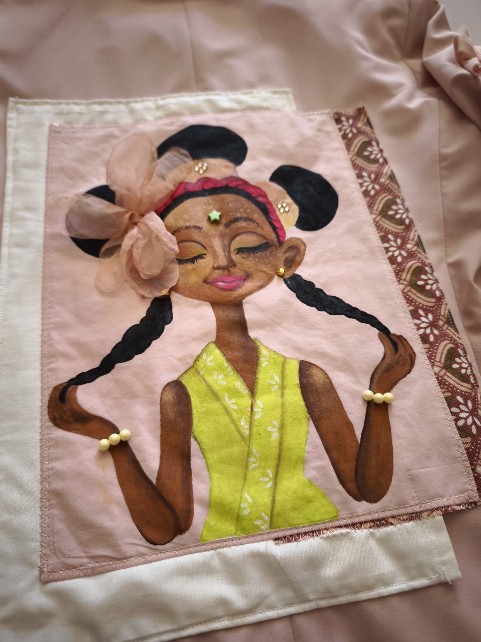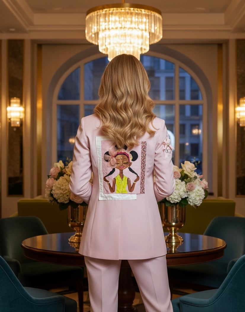 Blazer de cuello de solapa clásico y manga larga. Confeccionada en un tejido de peso medio y caída fluida (Tencel o similar) en un hermoso color rosa pastel (o rosa blush). Esta prenda única de diseño artesanal presenta una aplicación en la espalda que combina una ilustración pintada a mano con toques de volumen y detalles cosidos, como el lazo de organza y adornos de pedrería. Presenta bolsillos de ojal laterales y cierre frontal con un solo botón forrado al tono.