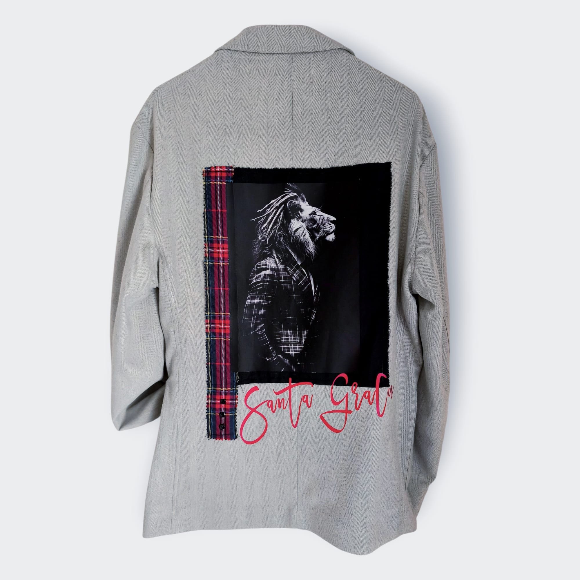 La espalda luce una gran aplicación de un león en blanco y negro vestido con una camisa de cuadros, enmarcado por una franja de tela escocesa (tartán) en rojo y negro. Finaliza con un vibrante texto en rojo, "Santa Gracia".