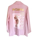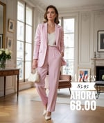 Blazer de cuello de solapa clásico y manga larga. Tejido de tencel o similar con caída fluida en un hermoso color rosa pastel (o rosa blush). Bolsillos de ojal laterales y cierre frontal con un solo botón forrado al tono.
