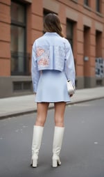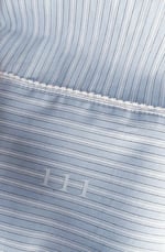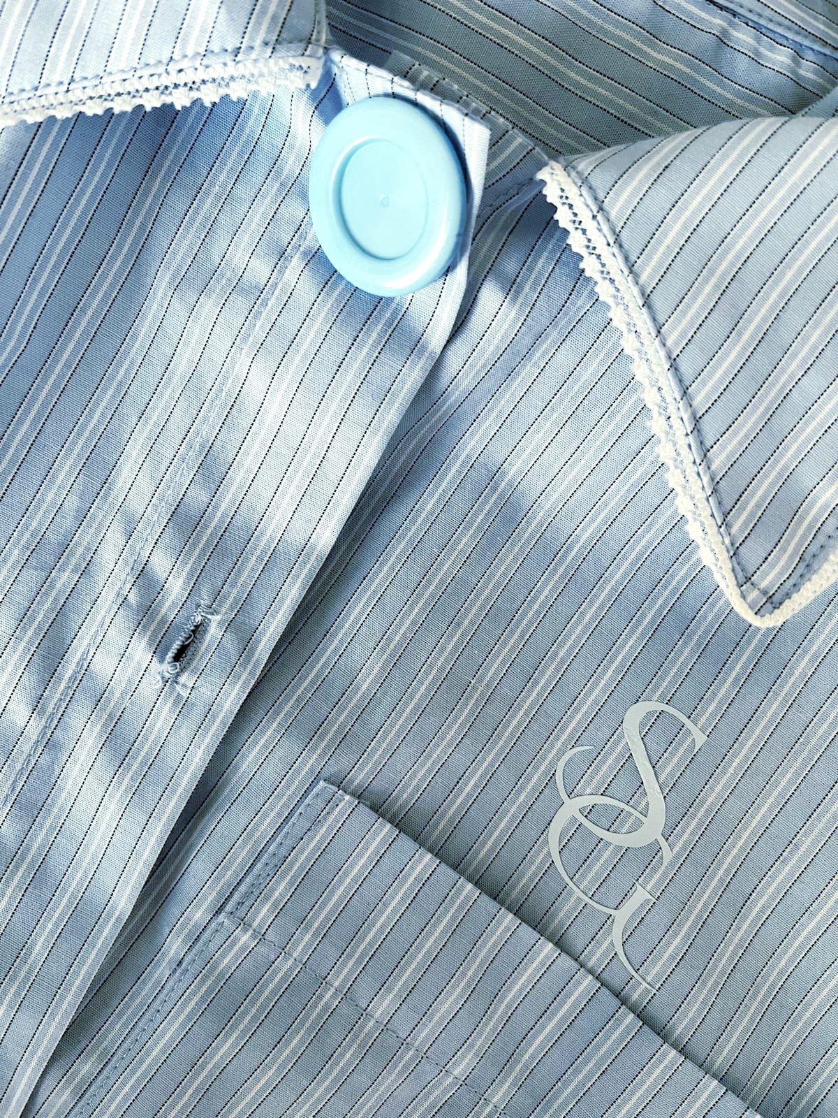 Camisa crop de cuello clásico y manga larga. Tejido de algodón a rayas finas en color azul cielo y blanco con un corte moderno y juvenil que deja ver ligeramente el abdomen. Presenta un cierre frontal de botones ocultos.