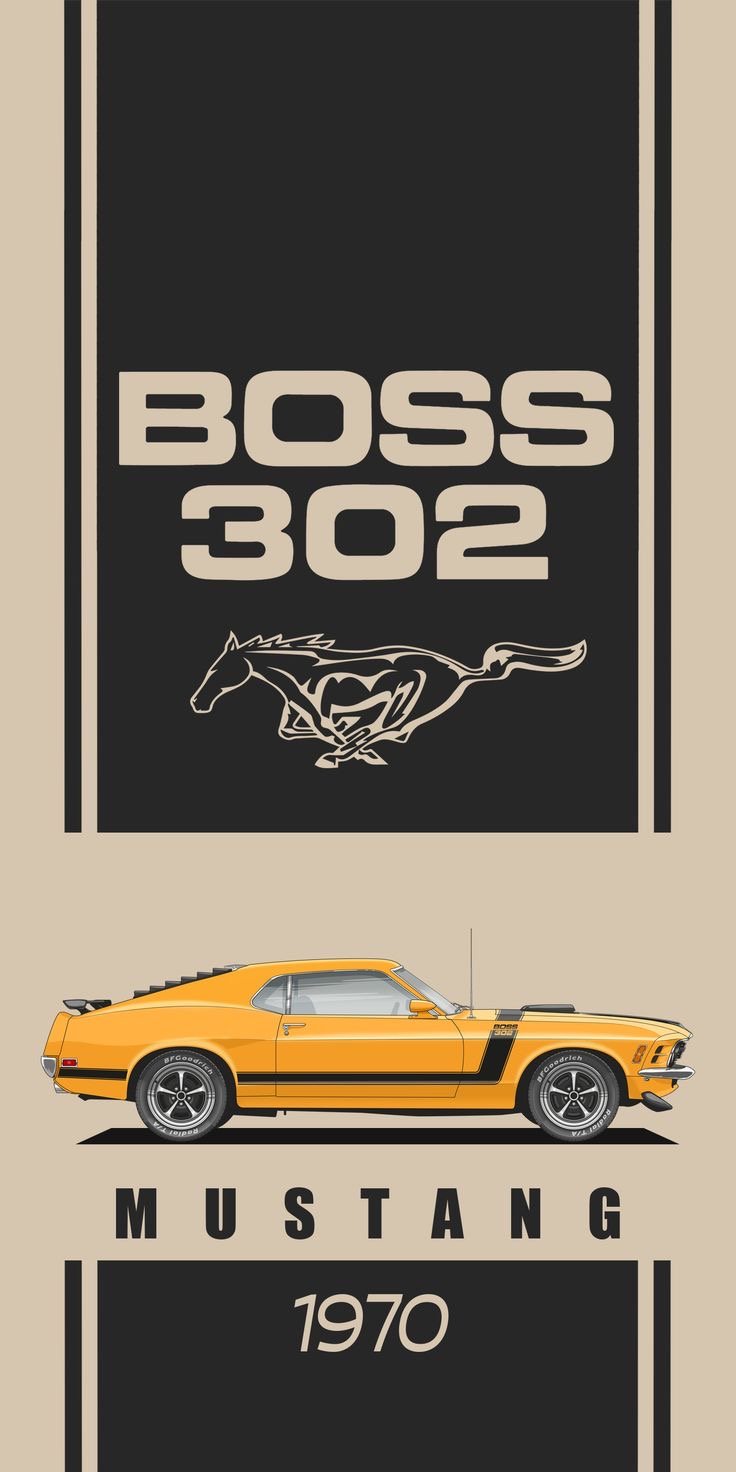 En la Espalda (BOSS 302): Un patch central que rinde culto al icónico Mustang BOSS 302 de 1970, combinando el logo y el coche naranja en un gráfico vintage.