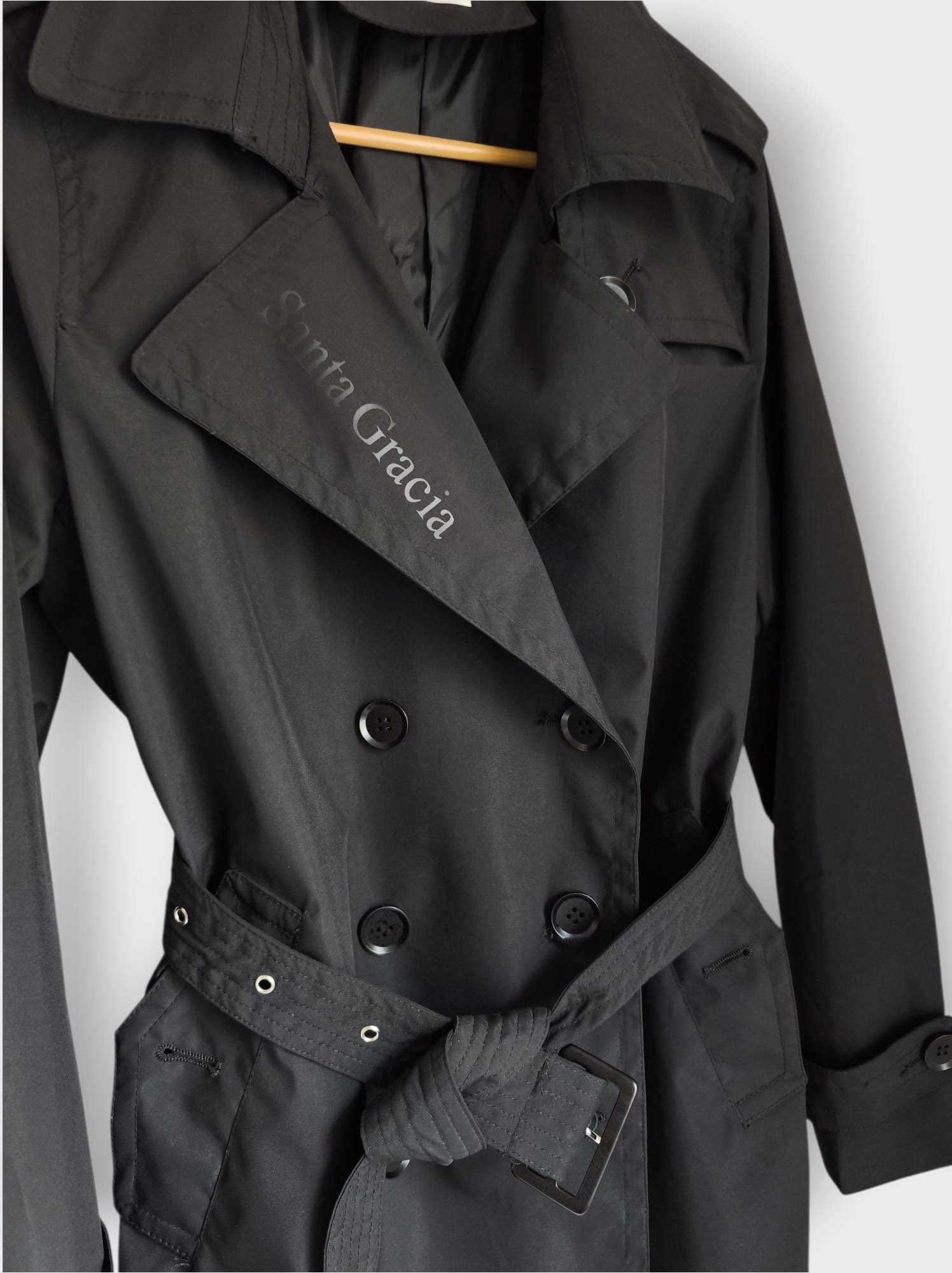 Gabardina Negra "Boss Chick" que transforma un clásico atemporal en una declaración de poder moderno. Con un elegante diseño de doble botonadura y cinturón ajustable, esta gabardina de corte clásico irradia sofisticación.