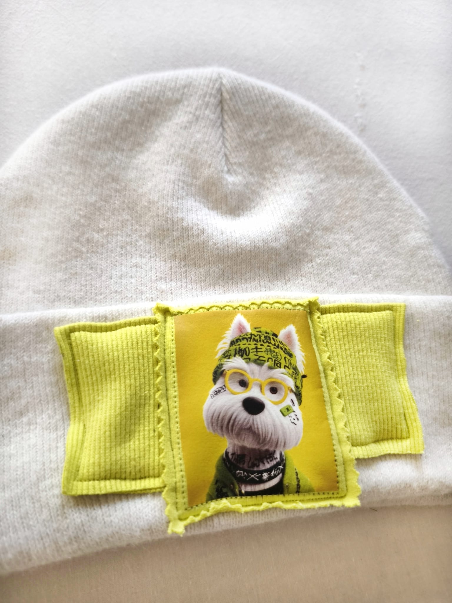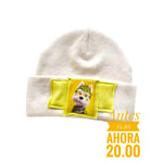 Este gorro de punto en color crudo presenta un diseño único y divertido. El suave tejido se complementa con un llamativo parche central de un perro con gafas, rodeado de detalles en un vibrante color verde limón. Es el accesorio perfecto para quienes buscan un toque de personalidad y estilo original en su look.