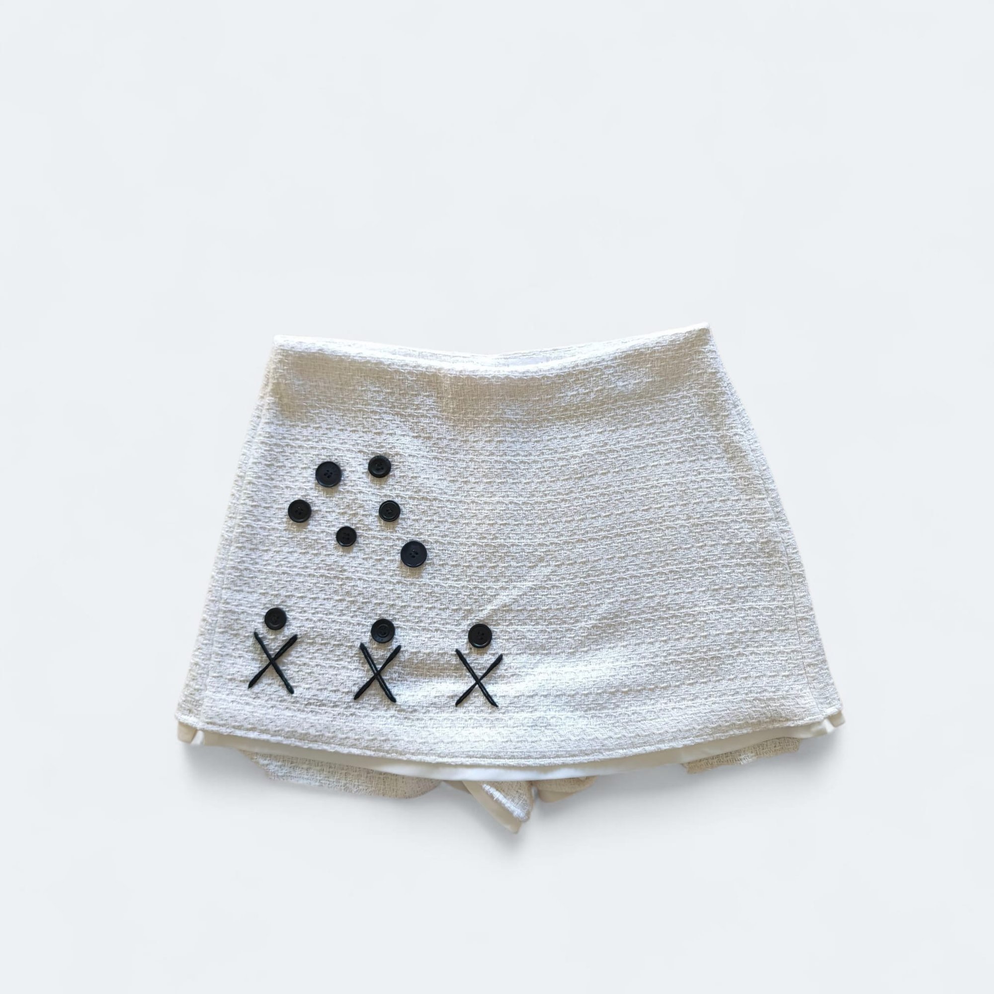 Minifalda Short (Skort) en Tweed Crudo que fusiona la textura clásica con un diseño contemporáneo y atrevido. Confeccionada en un tejido tweed en tono crudo donde la parte posterior está adornada con un patrón de puntos negros y tres símbolos de "X" bordados en hilo negro, que le otorgan un aire de arte callejero y grunge sofisticado.
