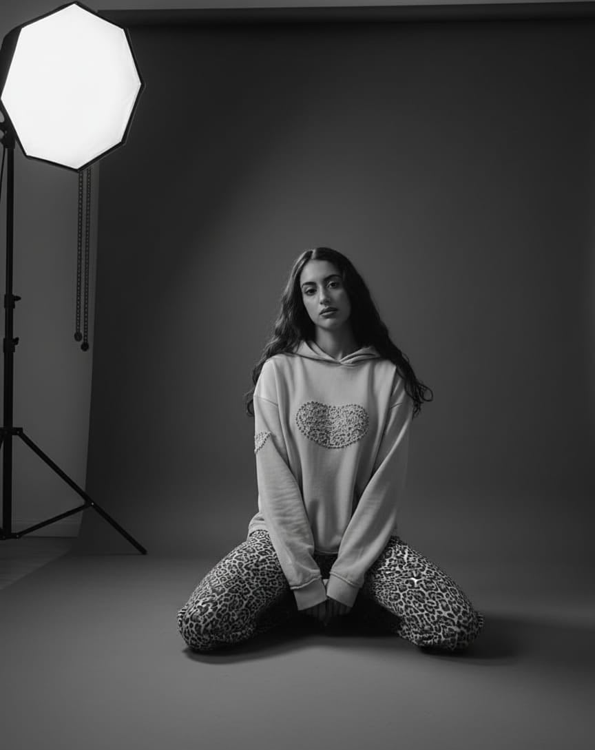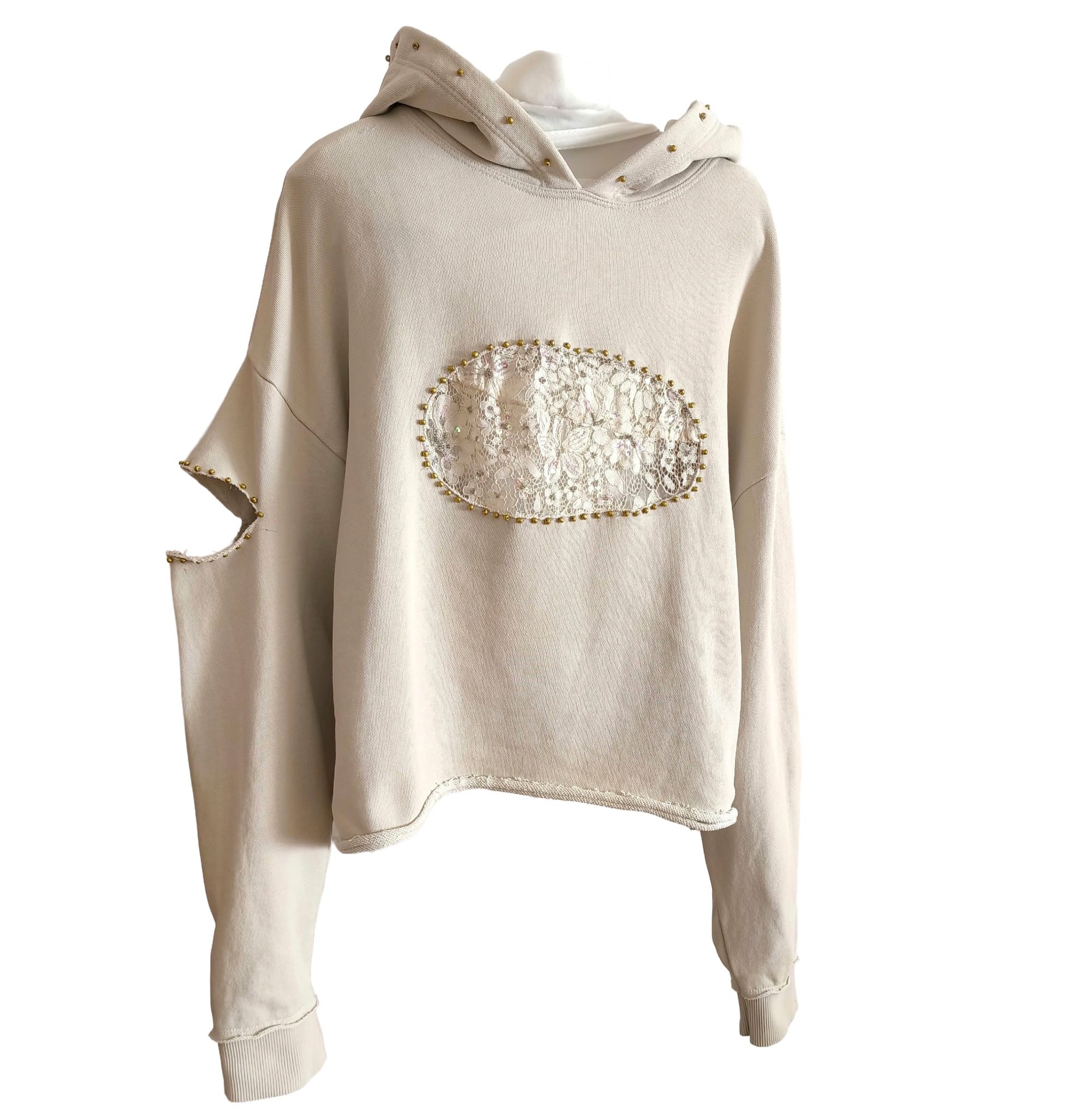 Confeccionada con un suave tejido en beige, esta sudadera de la Colección Princess eleva el estilo urbano a otro nivel. Los cortes circulares, estratégicamente decorados con incrustaciones brillantes, añaden un toque de fantasía y sofisticación.