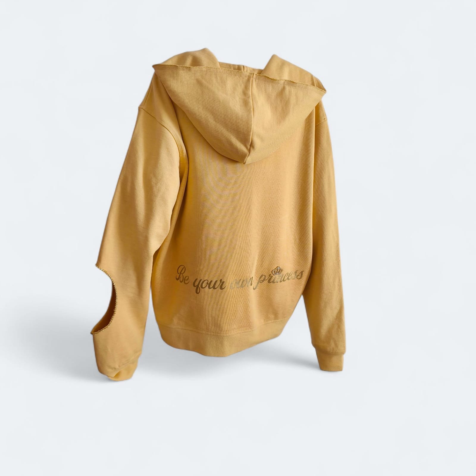 Confeccionada con un suave tejido en camel, esta sudadera de la Colección Princess eleva el estilo urbano a otro nivel. Los cortes circulares, estratégicamente decorados con incrustaciones brillantes, añaden un toque de fantasía y sofisticación. En la espalda, el elegante bordado "Be your own princess" actúa como un recordatorio para que vistas con confianza y empoderamiento.