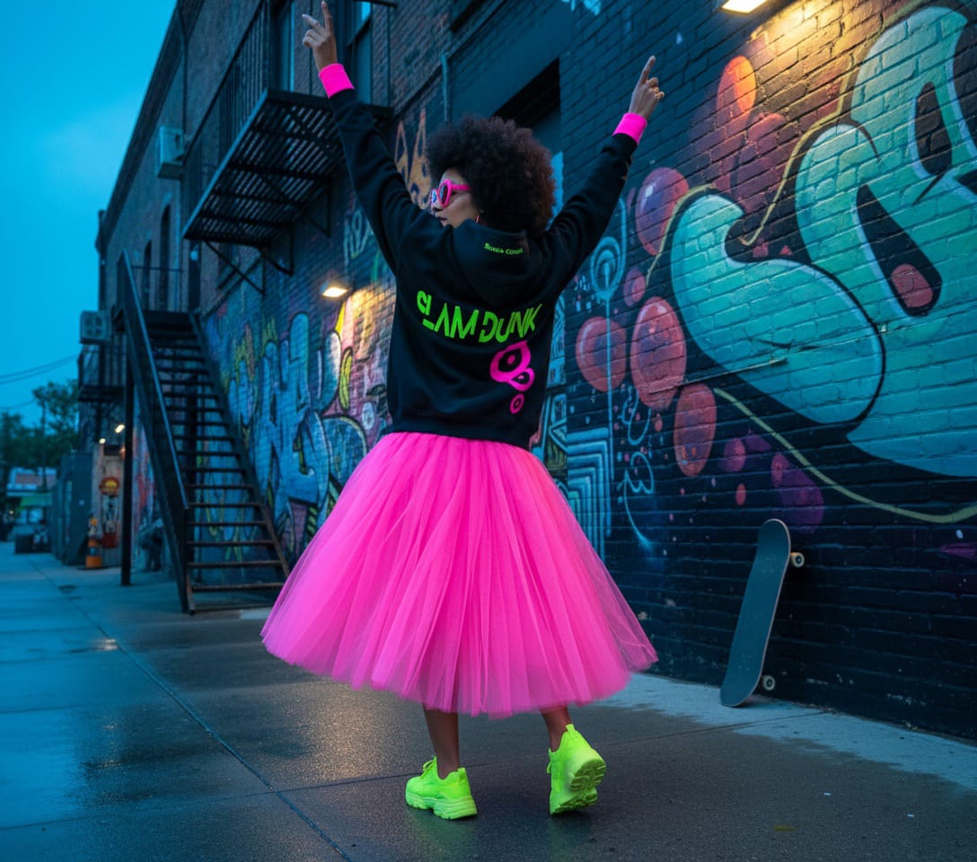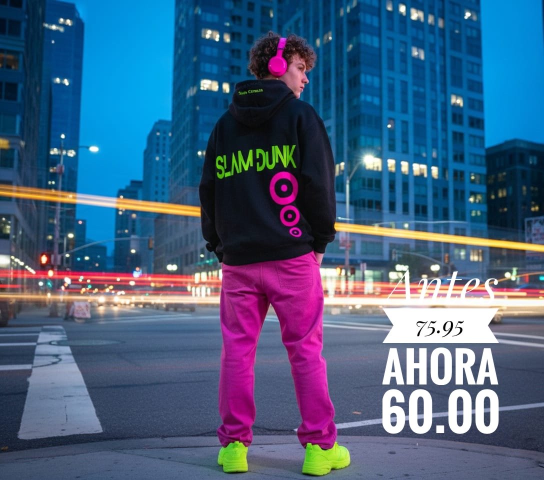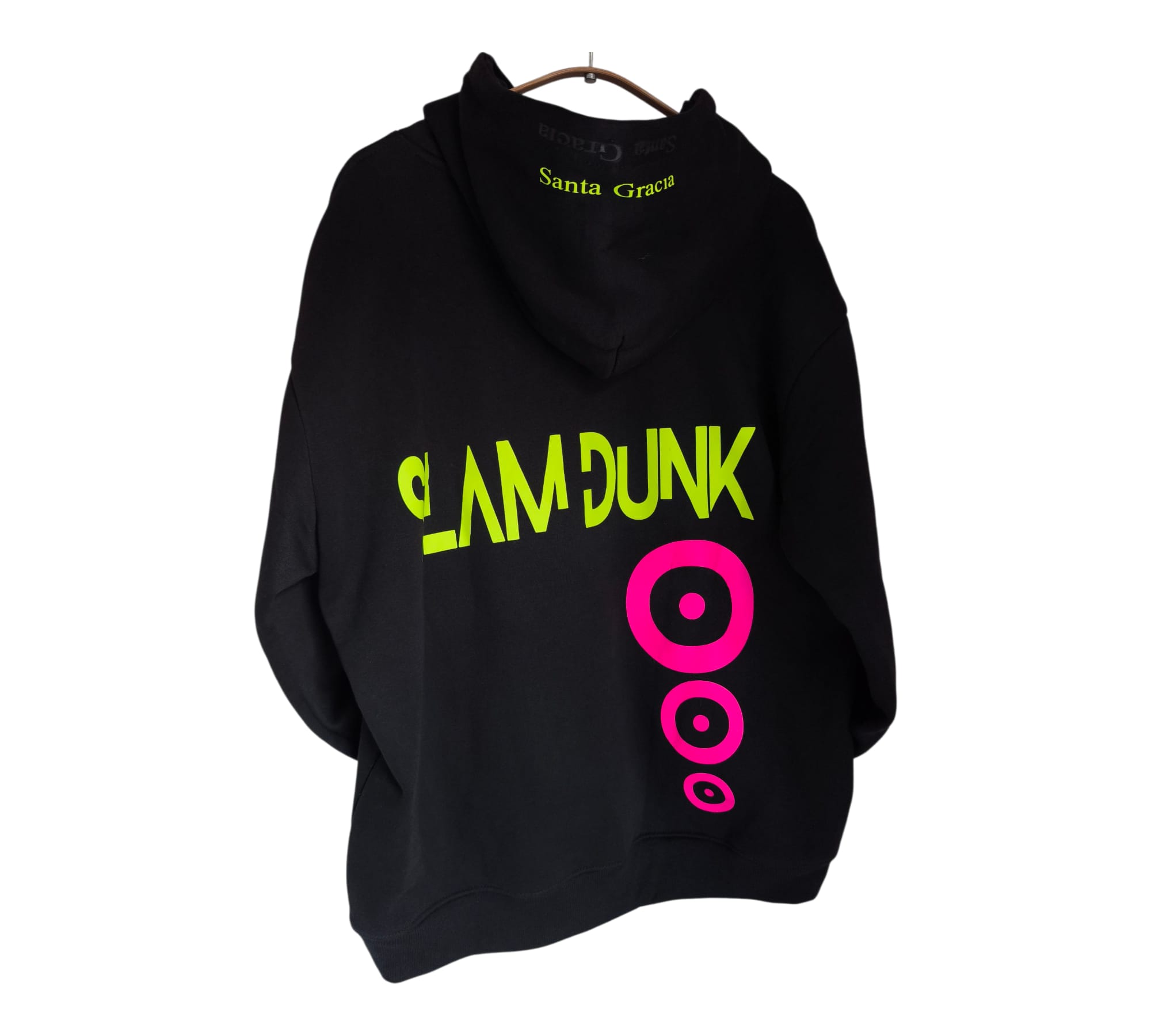 Esta sudadera oversize es pura energía. En negro profundo con un diseño gráfico neón en verde lima y fucsia que no pasará desapercibido. La espalda lleva nuestro audaz mensaje "SLAM DUNK" y los aros distintivos, mientras que el frente celebra tu exclusividad con un código de barras "LIMITED EDITION".