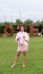 Trench denim oversize en rosa pastel. Una pieza de declaración con un potente mensaje en la espalda: "GIRL BOSS" y tacones de aguja.