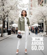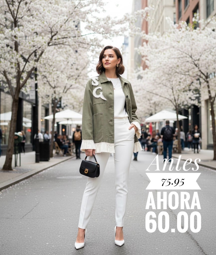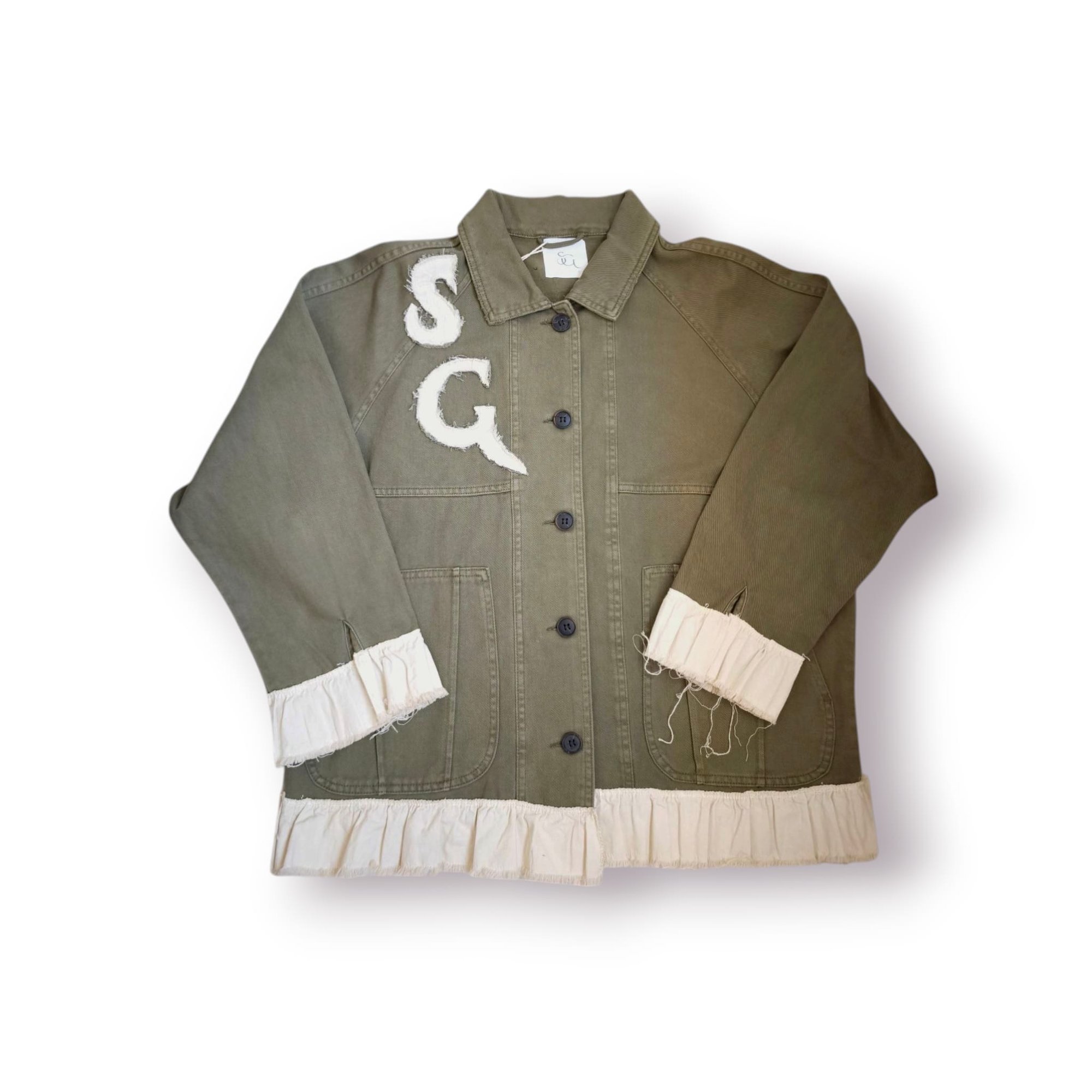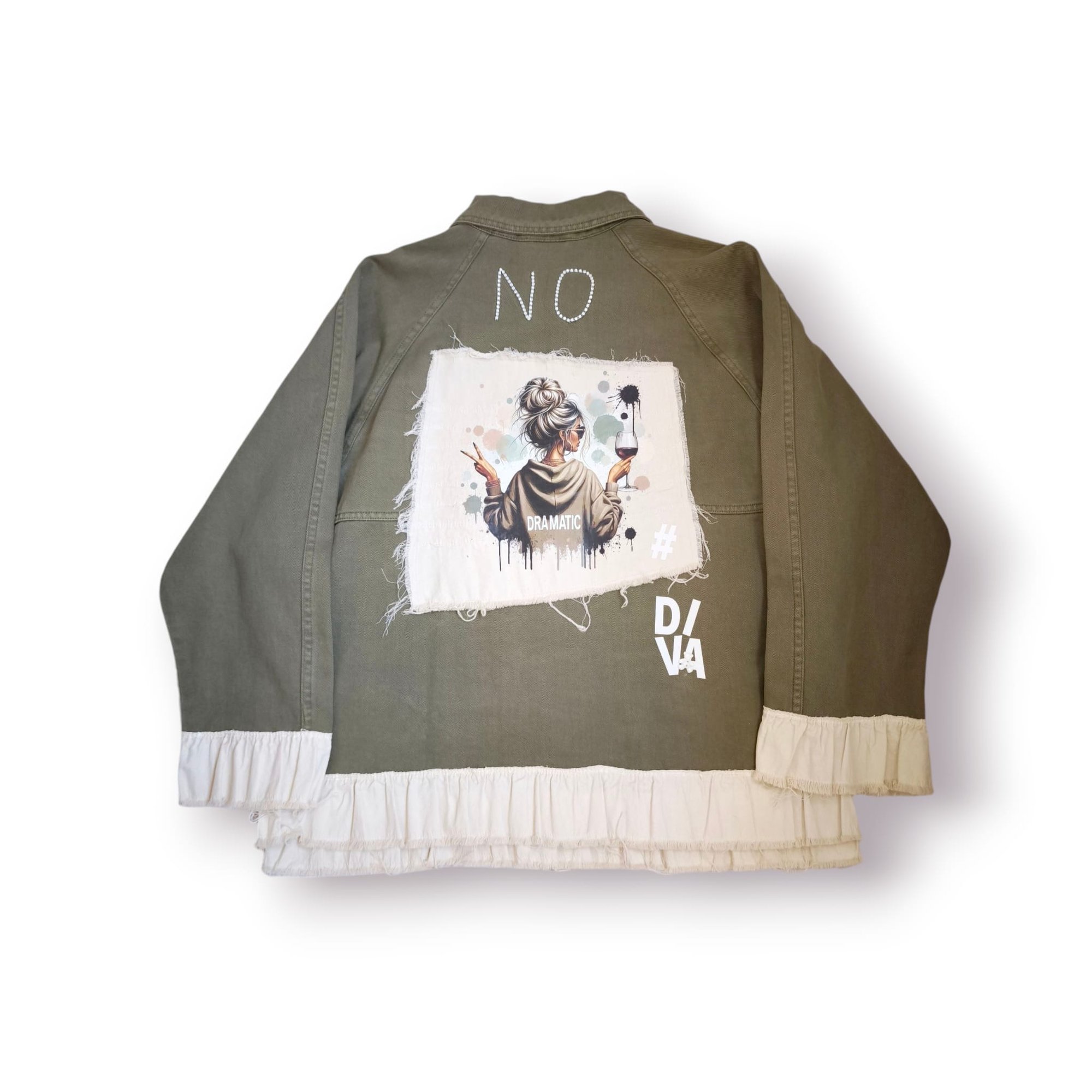 Chaqueta de cuello de solapa clásico y manga larga. Tejido de sarga o lona de algodón con caída estructurada en un hermoso color verde caqui (o verde oliva). La prenda ha sido customizada con un gran parche trasero con una ilustración art print temática y apliques de strass formando la palabra "NO" en la espalda. El bajo y los puños incorporan volantes fruncidos de tela color crema o crudo, aportando un contraste fluido y femenino al estilo militar.