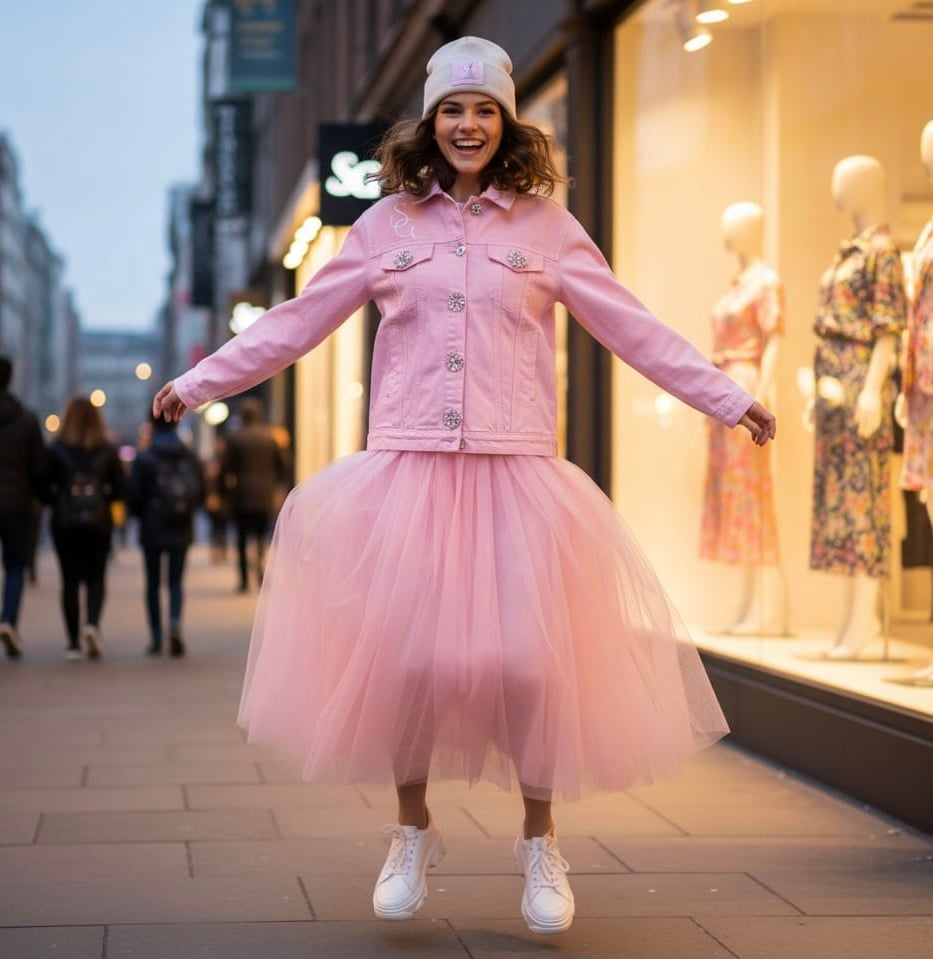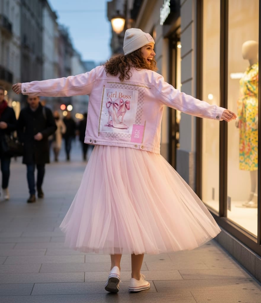 Trench denim oversize en rosa pastel. Una pieza de declaración con un potente mensaje en la espalda: "GIRL BOSS" y tacones de aguja.