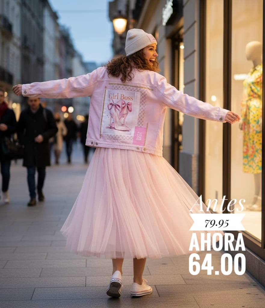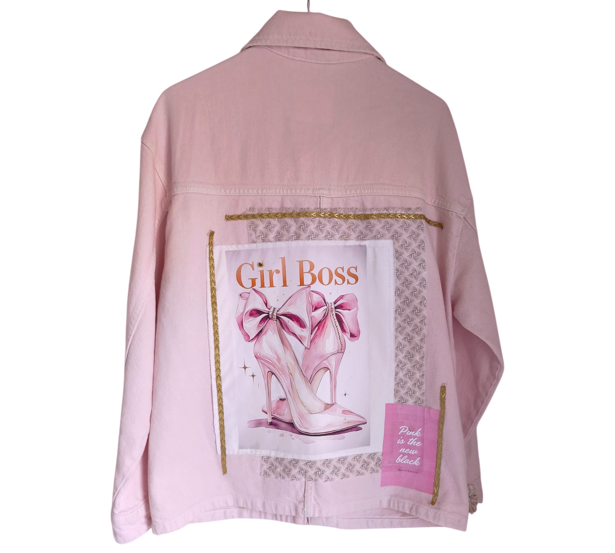 Fusiona la comodidad del denim con el empoderamiento femenino. Con detalles exclusivos como el ribete dorado y el parche "Pink is the new black".