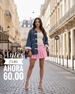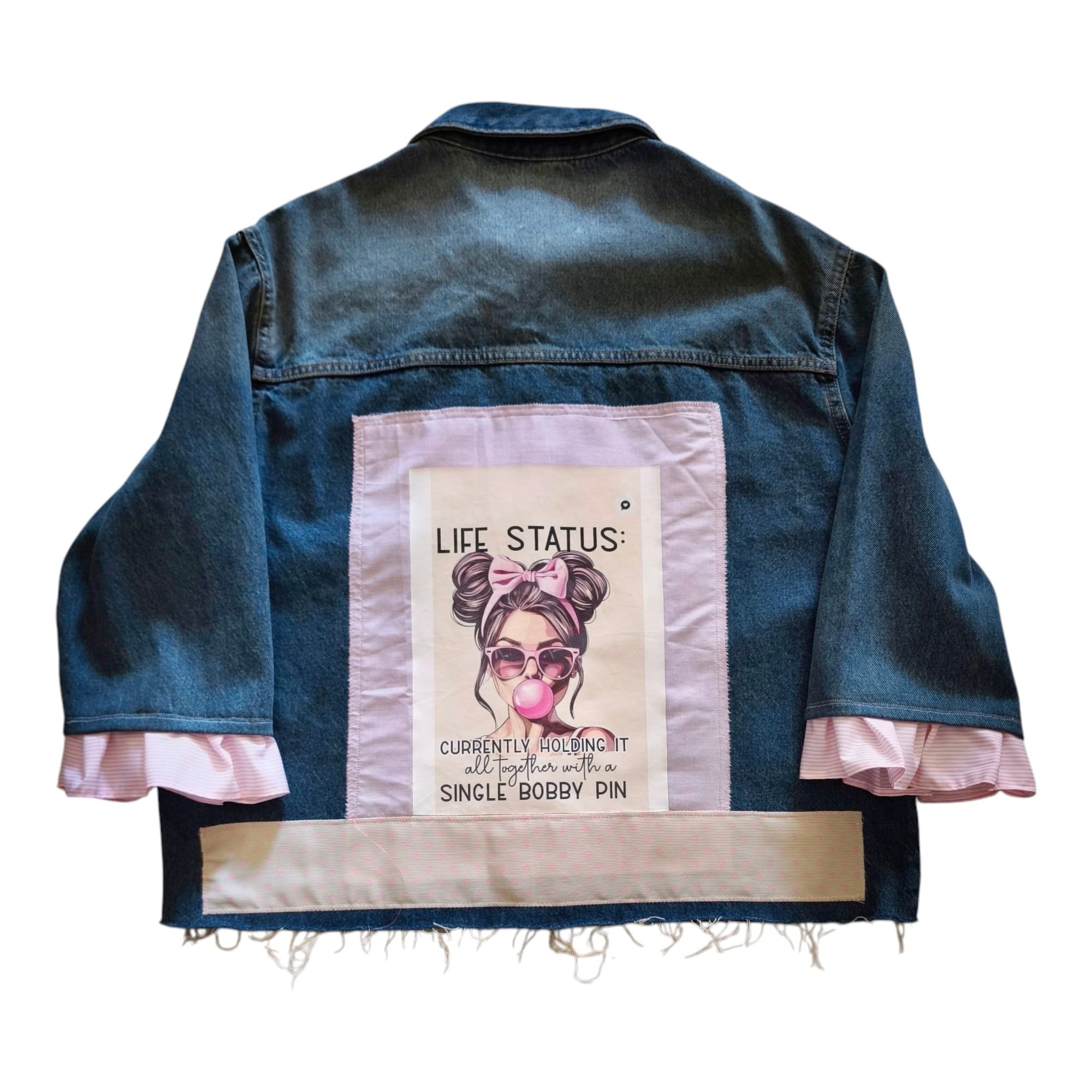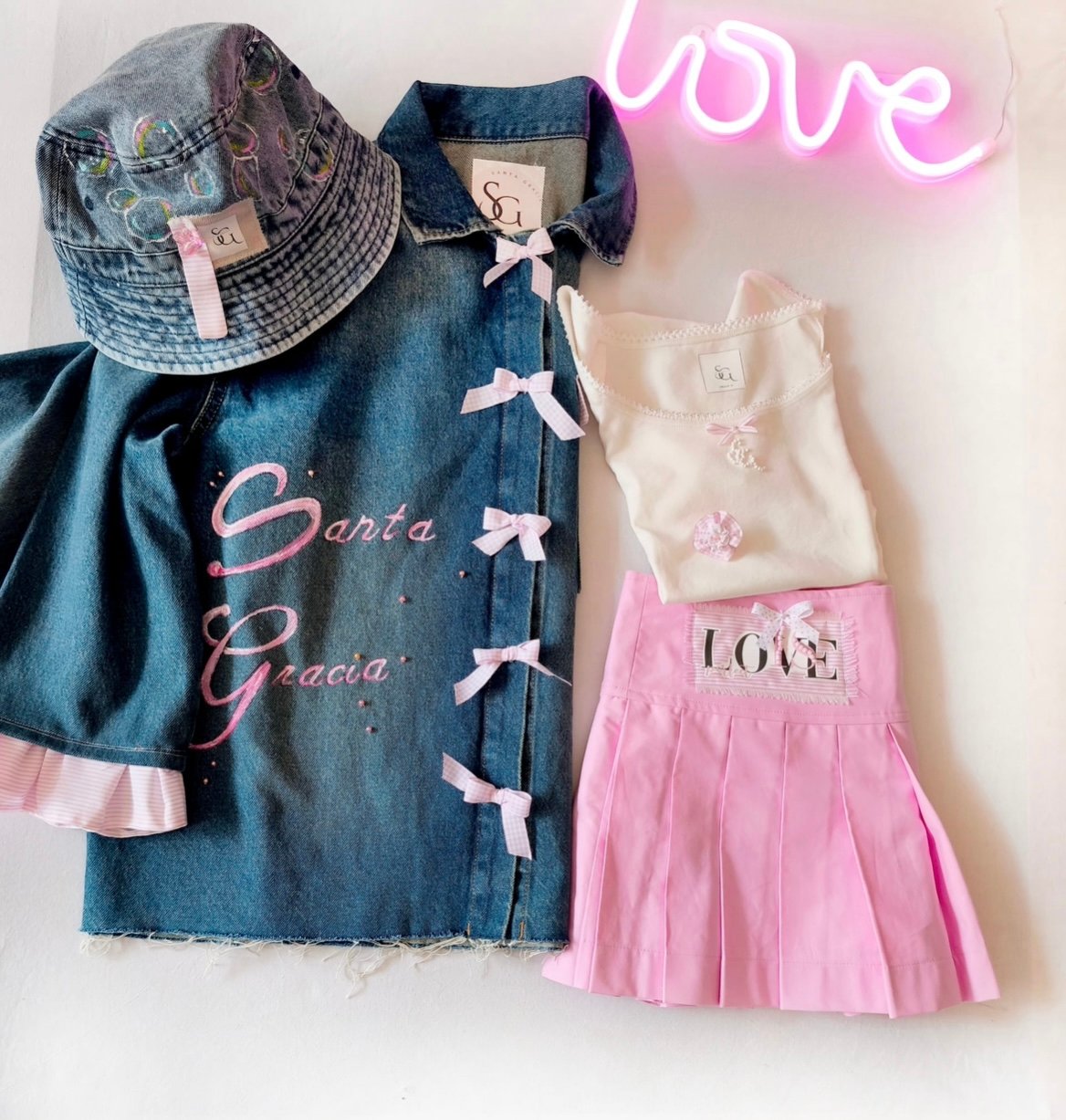 Chaqueta vaquera de cuello camisero clásico y manga larga con bajo desflecado. Confeccionada en un tejido denim de lavado medio y corte oversize, ideal para un look juvenil y relajado. Esta prenda exclusiva presenta un gran bordado artesanal en hilo rosa con el texto "Santa Gracia" y está adornada con lazos de cuadros vichy en color rosa pastel a lo largo de los botones frontales. Incluye bolsillos de parche frontales en el pecho y cierre de botones metálicos.